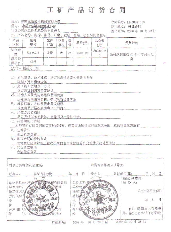 2008年10月28日中國(guó)人民解放軍總參三部物資處3名解放軍干部來我公司實(shí)地考察??疾毂容^后對(duì)我公司的規(guī)模和產(chǎn)品給予了極大的肯定,并就一直聯(lián)系的要購(gòu)買的25臺(tái)鋁合金升降機(jī)簽訂了訂貨合同?,F(xiàn)我公司已按照約定如期交貨,總參三部驗(yàn)收后非常滿意,并已全部付款到位。