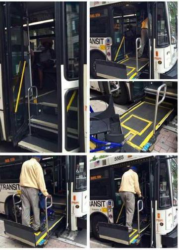 比如在公交車車門處,還有這么一個為殘疾人設(shè)置的功能,在臺階那里藏有一塊可伸縮和升降的平臺,殘疾人只要站上去就把殘疾人和殘疾車直接升降運送到公交車的車廂里面。很人性化。