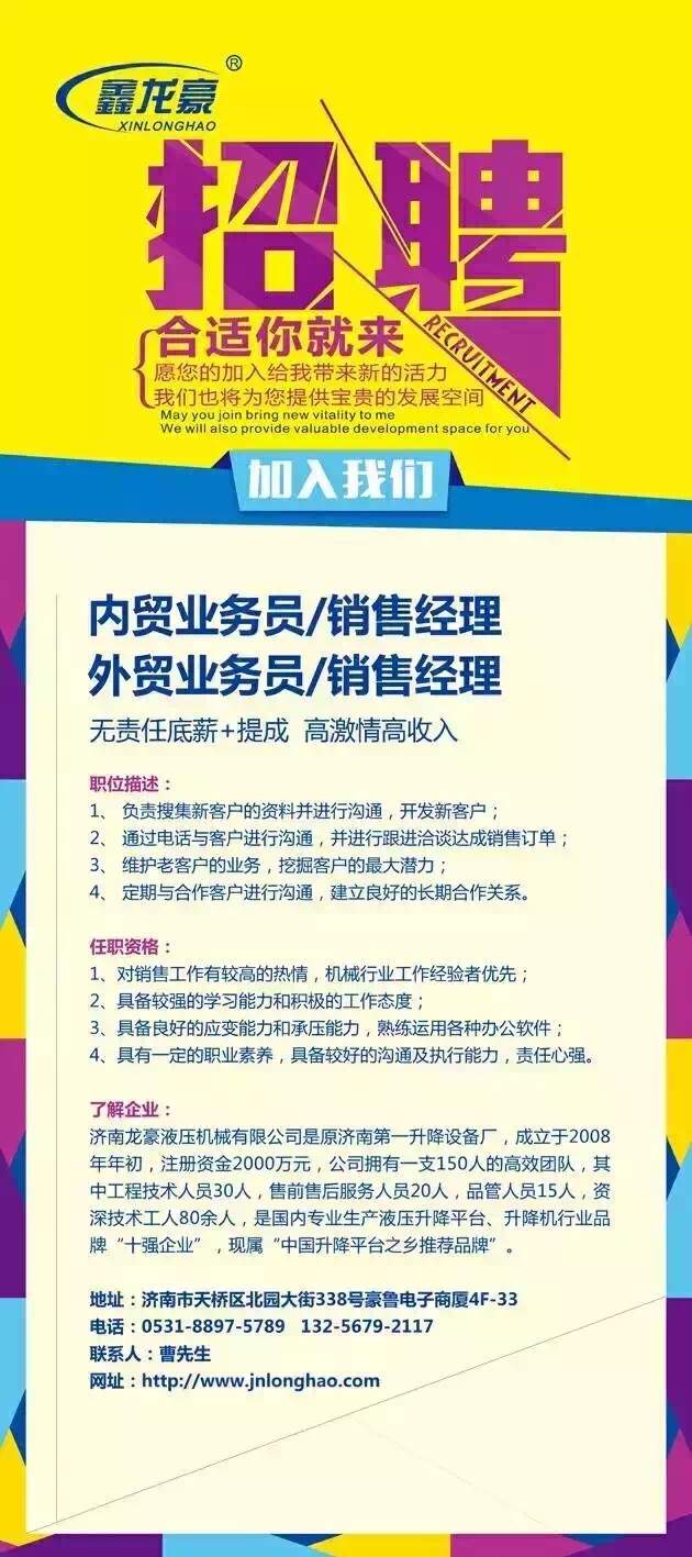 無責任底薪+提成,每月輕松收入過萬!龍豪液壓,升降機的廠家,歡迎你的到來!