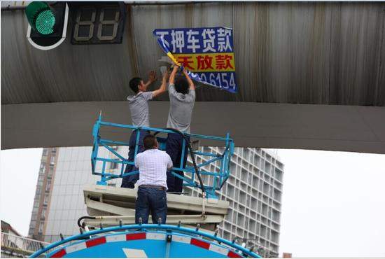 目測人行道過街天橋橋身垂直距離地面8米,100cm*80cm見方的藍色 “牛皮鮮”上印著車貸廣告。關注到這些廣告的市民都在猜:“這么高的天橋,牛皮蘚是么樣貼上去的?”據青山城管“三亂”整治專班負責人介紹,友誼大道兩座天橋東南西北四個方向的紅綠燈旁均被貼上了同一內容的“牛皮癬”,應該是前天晚上(11日)干的,估計有兩種方式張貼:一是借助比較高的車身站立進行,這需要大型車輛配合;二是腰系安全帶從橋面懸垂下去,這很簡單,但是很危險。不管是怎么貼上去的,只要發(fā)現一處,就清理一處,這點事難不倒我們。有困難找龍豪升降機,除了及時清理外,還將對當事人展開調查,依法進行處置。